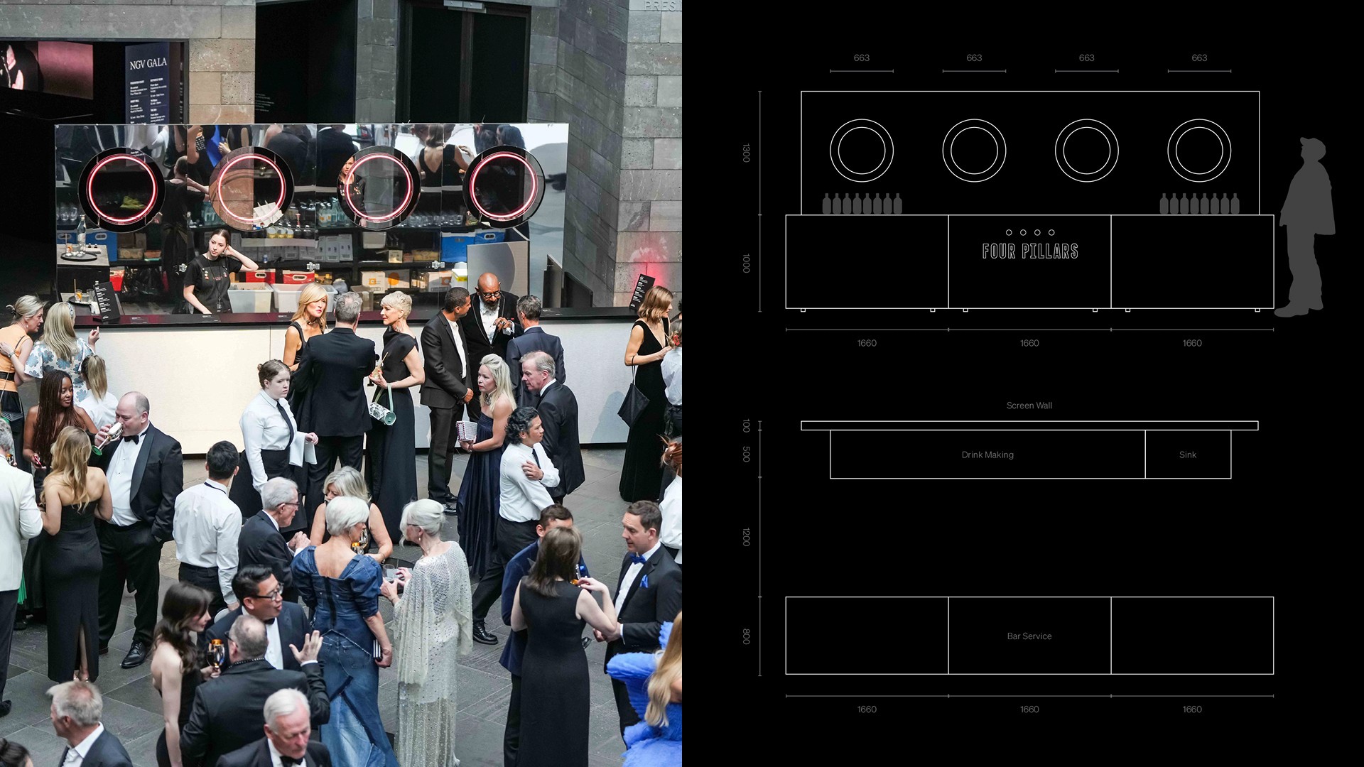 Key projects included placemaking and wayfinding at the Sydney Drinks Lab and Healesville Distillery, custom bar experiences for the Cocktail Cart and the NGV pop-up, and a branded activation at the Laneway Music Festival. Across these initiatives, materials were carefully selected in collaboration with architects to complement each space, while budgets, timelines, and operational constraints informed every design decision.