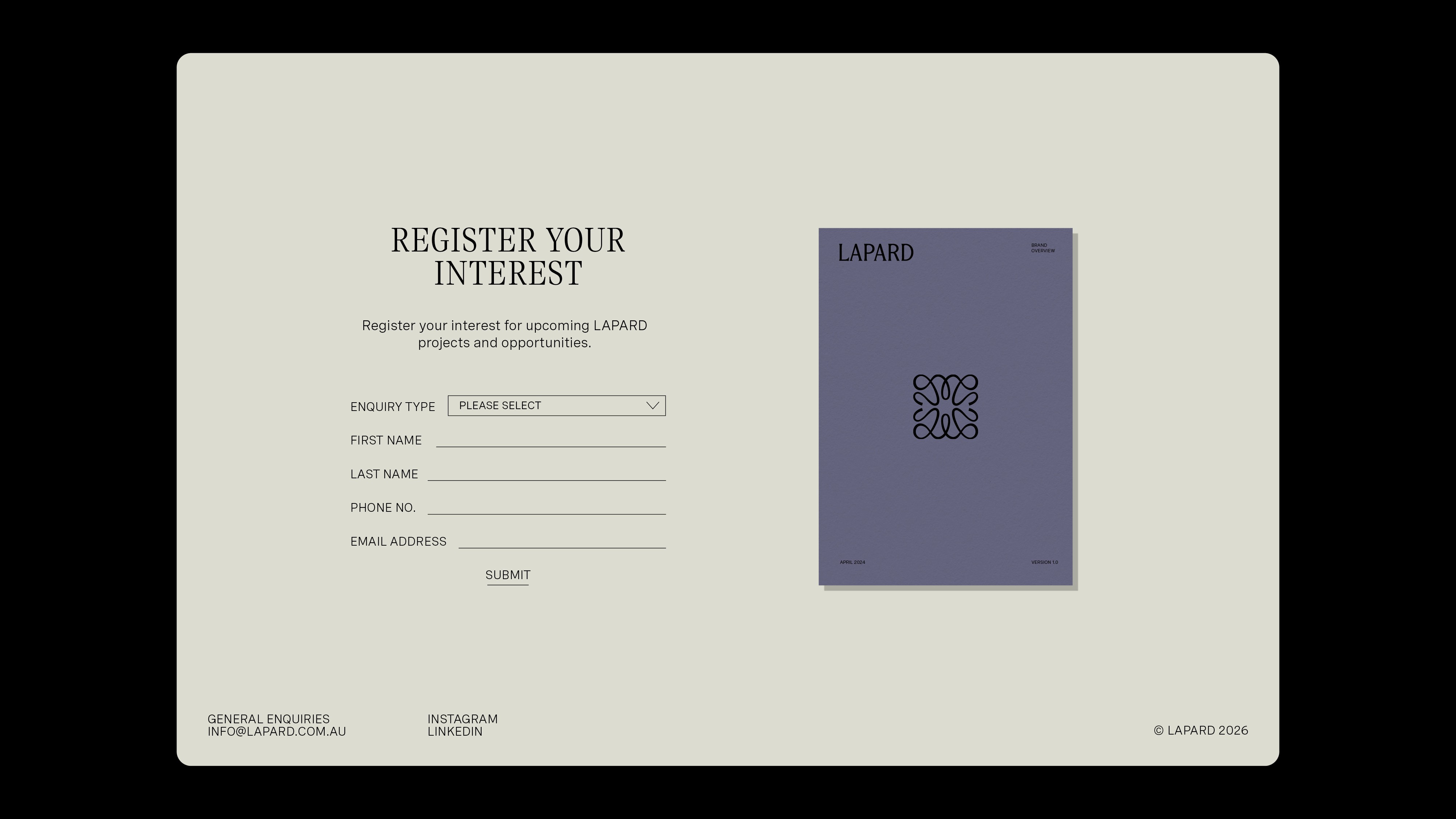 The resulting identity communicates Lapard’s commitment to timeless design and modern sophistication, projecting confidence and reliability across their digital presence and marketing materials. By distilling heritage influences into a modern, refined mark, the brand now reflects a developer that honours the past while shaping spaces for the future.